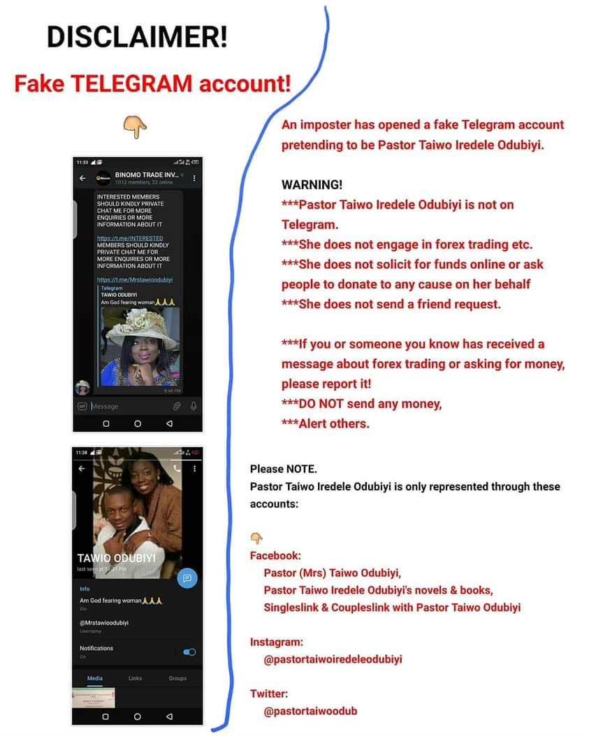 An imposter, a deceiver of the brethren has opened a FAKE TELEGRAM account, pretending to be Pastor Taiwo Iredele Odubiyi. The fake telegram account is Tawio Odubiyi / Kinomo trade investment.
